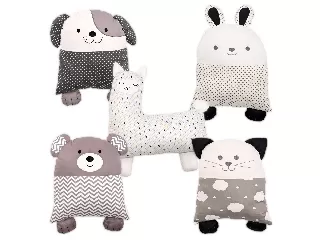 JELLEMZŐK: Használata 3 éves kortól ajánlott puha, kényelmes párnák állatos formával és mintákkal Anyaga: 100% pamut; töltet: poliészter A szett 5 d...