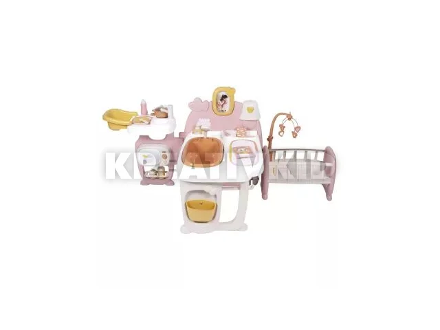 Nagy babajáték-központ 3 különböző területtel: konyha, fürdőszoba és hálószoba.
