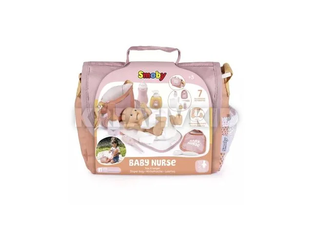 Baby Nurse pelenkázótáska állítható pánttal és kis fogantyúval. 1 db cumisüveg tartó is beépítve. 8 db tartozék: 1 db cumisüveg, 1 db szirup eltávolítható fedéllel, 1 db kanál, 1 db mechanikus működésű termosz, 1 db mechanikus hőmérő, 1 db pelenka és 1 db előke. A táska fedele kinyitható, így pelenkázó alátétként is használható. Egy kis tároló zseb is található benne. 42 cm-es babákhoz. A baba nem tartozék.