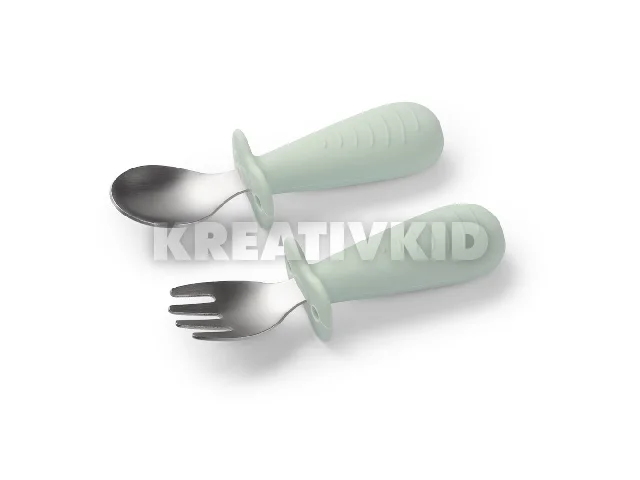 Ez a biztonságos evõeszközkészlet tökéletes a kanál és a villa használatának elsajátításához kisgyermeked számára. A készlet kiváló minõségû rozsdamentes acélból készült, míg a nyele csúszásgátló szilikonból.