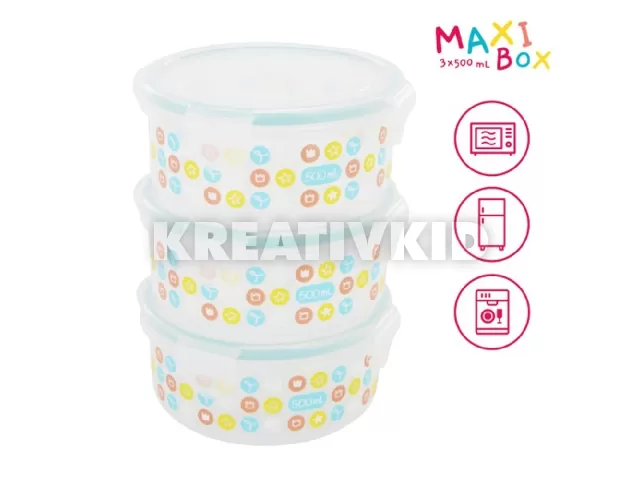 3 darab hermetikusan záródó 500 ml-es ételtároló. Mosogatógépben mosható. Használható hûtõben, fagyasztóban és mikrohullámú sütõben is. Garantáltan BPA-mentes, PVC- és ftalátmentes.