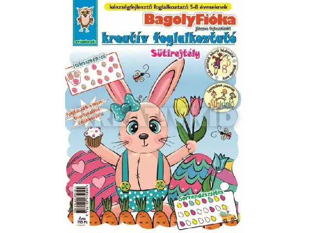 A Sütirejtély foglalkoztatóban folytatódik a Bagolykaland Erdőmezőn sorozatunk. Egy aranyos, húsvéti történetet olvashatunk, melyben Mackó Maja és családja megfejtik a sütirejtélyt. A foglalkoztató füzet továbbá rengeteg ügyesítő feladatot tartalmaz, melyek a tavasz és a húsvéti ünnepkör hangulatát idézik meg. Ez egy igazán bájos, vidám, színekkel teli füzet, mely nemcsak mosolyt csal az apróságok arcára, és szórakoztató időtöltést nyújt nekik, de mindeközben még fejleszti is őket. Feladataival a gyerekek gyakorolhatják a sorrendiséget, átvezethetik a csibét a labirintuson, segíthetnek a nyuszinak tojásokat festeni, számolhatnak, színezhetnek. A mókás feladatok megoldása közben, fejlődik az írás- és számolási készségük, megtanulnak koncentrálni, önállóan dolgozni, így sokkal könnyebb dolguk lesz majd az iskolában. Ebben a számban is megtalálhatóak az együttműködő partnerünk, az Áthidaló Iskola előkészítő program feladatai is. Szerezzétek be időben! Hozzon a nyuszi, hasznos és szórakoztató ajándékot!Játszva fejlesztenek a szórakoztató feladatok!