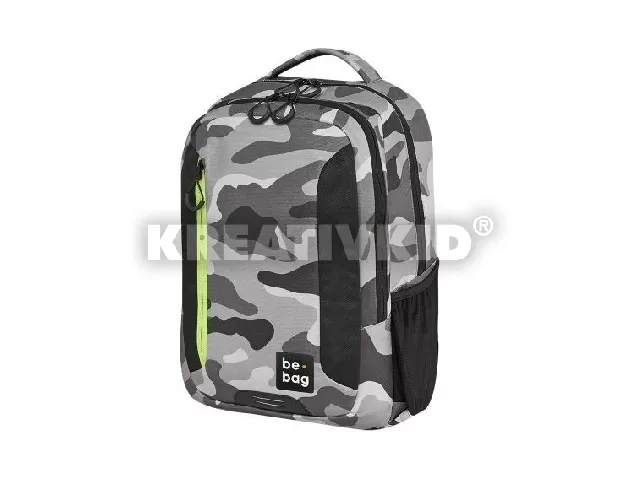 be.bag be.adventurer iskolai hátizsák Camouflage, 18 literes, 30x18x43 cm-es méretben, 2 nagy tárolórekesszel, rendszerezőzsebbel, első zsebbel, 2 oldalzsebbel, párnázott fogófüllel, ergonomikusan hátkialakítással és ergonomikusan formázott vállpántokkal, mellkaspánttal, fényvisszaverő csíkokkal.