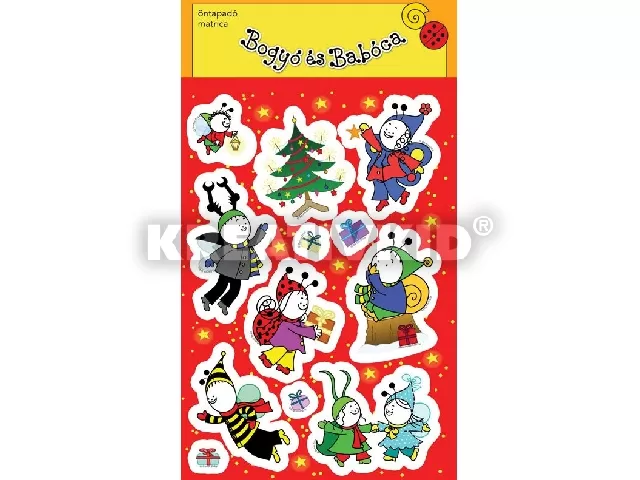 A Karácsony matricacsomag számos Bogyó és Babóca ábrás matricát foglal magában, amelyek biztosan vidám perceket okoznak majd a kicsiknek. A csigafiú és a katicalány önfeledten játszanak, ajándékoznak a karácsonyfa körül, amint a mesékben is megszokhattuk.