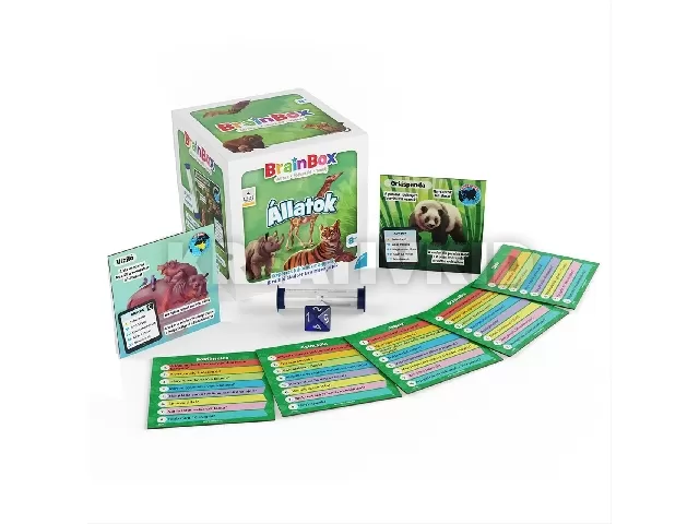 Brainbox: Állatok - új kiadás. Húzz egy kártyát, tanulmányozd, és jegyezz meg minél több információt 10 másodperc alatt. Ezután fordítsd le a kártyát, dobj a kockával, és válaszolj helyesen a kidobott számmal jelölt kérdésre. Ne húzd ám az időt, hiszen a homokórán gyorsan leperegnek a szemek! A válaszokat a kártyán ellenőrizheted. Ha jó megfigyelő vagy, és ismered az állatvilág titkait és érdekességeit, akkor a legtöbb kártya nálad landol!