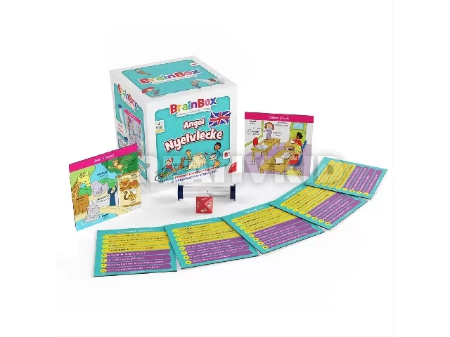 Brainbox: Angol nyelvlecke játék. Húzz egy kártyát, tanulmányozd, és jegyezz meg minél több információt 10 másodperc alatt. Ezután fordítsd le a kártyát, dobj a kockával, és válaszolj helyesen a kidobott számmal jelölt kérdésre. Ne húzd ám az időt, hiszen a homokórán gyorsan leperegnek a szemek! A válaszokat a kártyán ellenőrizheted. Ha jó megfigyelő vagy, és gyorsan tanulsz, akkor a legtöbb kártya nálad landol!