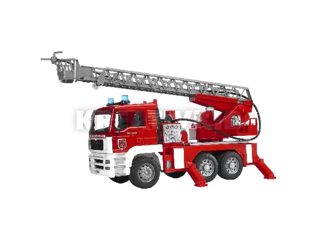 Olts tüzet a MAN tűzoltó teherautóval! A Bruder MAN tűzoltó autó vízpumpával egy 1:16 méretarányú, műanyagból készült piros teherautó, pumpával, villogóval és létrával felszerelve. Az autó nagyon élethűen néz ki, az ajtók nyithatók, és ha feltöltöd vízzel a tartályt, majd elkezded nyomkodni a pumpát, a fecskendőből víz fog előtörni. Az autó létrája emelhető, a tűzoltóautót le tudod támasztani, a járgány gombnyomásra fényeket és hangokat ad ki magából. A játék 2 darab AAA mikro ceruzaelemmel működik, a csomagolás az elemeket tartalmazza. A Bruder MAN tűzoltó autó vízpumpával méretei: 47 x 18 x 24 cm.