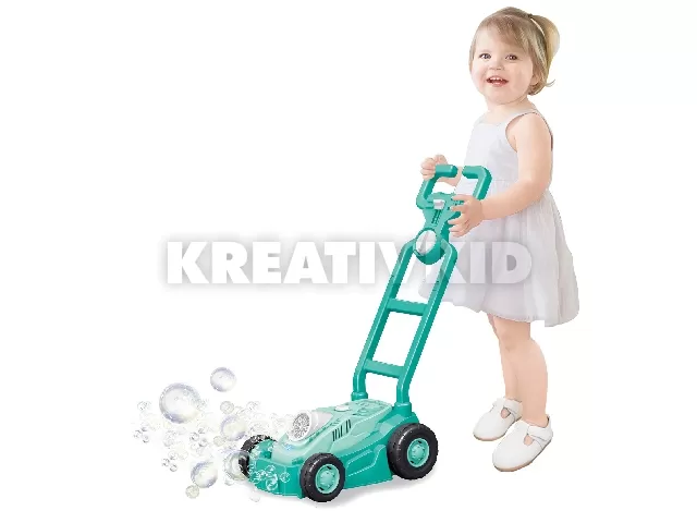 Szaladjatok a kertbe apával füvet nyírni, miközben a színpompás buborékok röpködnek a kertben mindenfelé a játék fűnyírótokból.