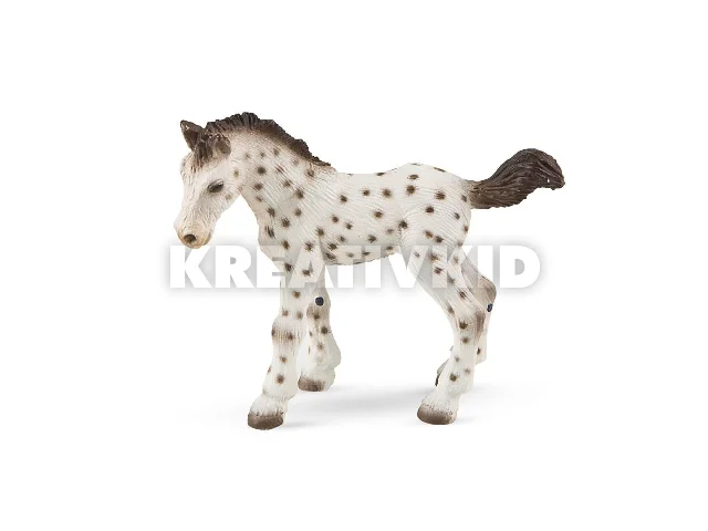 A Bullyland 9 cm-es Knabstrupper csikó figurája a Dániából származó, és a nyugalmáról ismert lófajta legnépszerűbb, párductarka színű példányát ábrázolja.