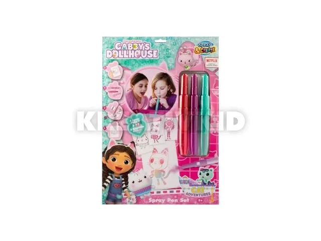 Canenco: Gabi babaháza kifestő filc festékszórókkal. A doboz 3 darab stencilt és 3 különböző színű, festékszóróként használható fújós filctollat tartalmaz.