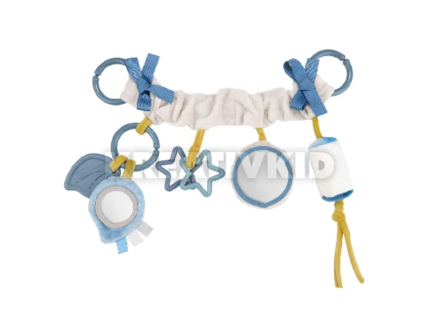 - Csengővel, csörgővel, suhogó elemekkel, biztonságos tükörrel és rugalmas rágható elemekkel rendelkezik