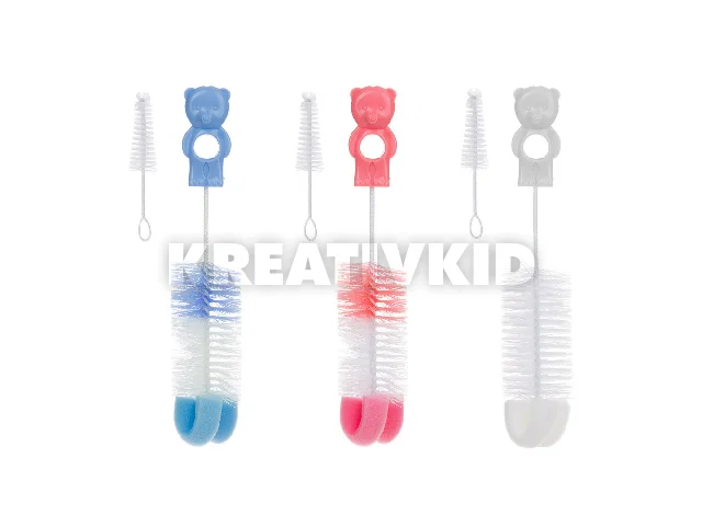 - A nagyobbik kefe ezen felül szivaccsal van ellátva, amely lehetővé teszi a cumisüveg aljának alaposabb tisztítását, a kisebbik pedig könnyedén megtisztítja az etetőcumi belsejét