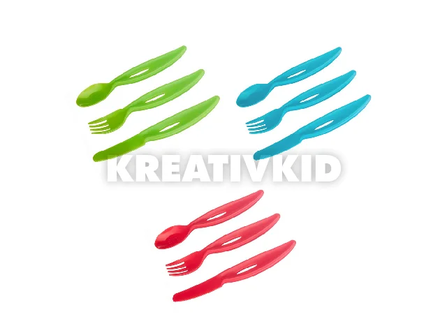 - Az evőeszközök széles nyéllel rendelkeznek, amely megkönnyíti a kis kezekben való tartást