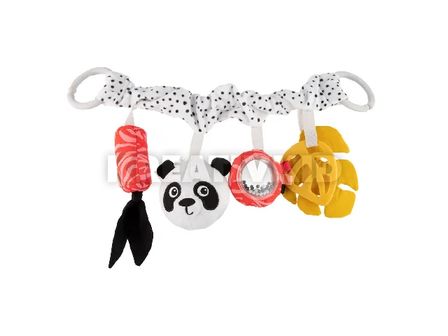 - A függőjáték minden egyes elemének más-más funkciója van - a masnis csengő lágy hangokat ad ki, a kellemes tapintású és puha anyagból készült puha plüsspanda megtartja a formáját, ha összenyomjuk, a tükröt színes csörgős cédulák veszik körül, a két levél - az egyik kellemesen zizeg, a másik pedig rágókaként enyhülést hoz fogzáskor