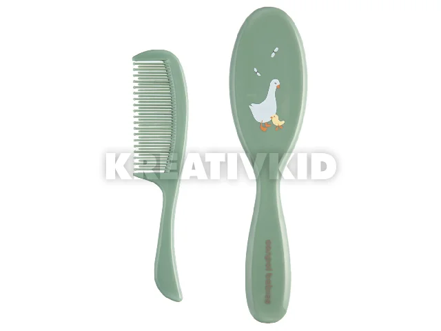 A szett egy puha sörtés hajkefét egy fésűt tartalmaz a baba hajának mindennapi ápolásához. A fésűnek lekerekített fogai vannak, amelyek nem irritálják a baba érzékeny bőrét. A kefe gyengéden masszírozza a baba fejét anélkül, hogy a hajat feltöltené elektromosággal. Tökéletes a születés utáni első napoktól kezdve. Többféle színben kapható.