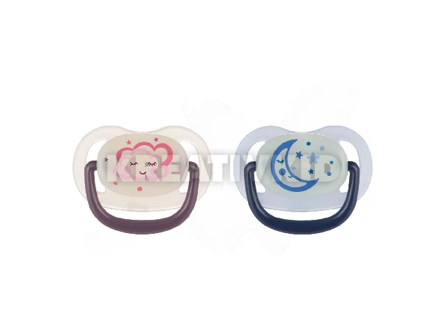 NIGHT DREAMS szilikon anatómiai (fogszabályzós) cumi, kiváló minőségű, szagtalan szilikonból készült. Anatómiai formájú szívórésszel rendelkezik. A szellőzőnyílásoknak köszönhetően a pajzs nem irritálja a baba érzékeny bőrét. A sötétben halványan világító korong megkönnyíti a cumi megtalálását éjszaka. BPA-mentes. Több színben elérhető.