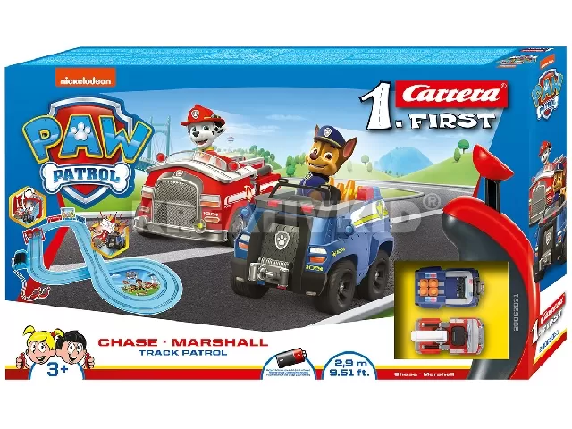Száguldozz a pályán Chase és Marshall autójával! A Carrera GO Mancs őrjárat Track Patrol autópálya egy 1:50 méretarányú versenypálya, ahol a Paw Patrol rajzfilmsorozat két főszereplőjével vehettek részt a futamokon. Chase egy kék rendőrautóval, míg Marshall egy piros tűzoltó autóval versenyzik, a pályát könnyű összerakni, kisebb gyerekek is már élvezhetik vele a száguldás örömét. A pályát 8-as formában lehet lerakni, a játék 4 darab C bébielemmel működik, a csomagolás az elemeket nem tartalmazza. A Carrera GO Mancs őrjárat Track Patrol autópálya lerakott méretei: 114 x 88 cm, pálya hossza: 2,9 m.
