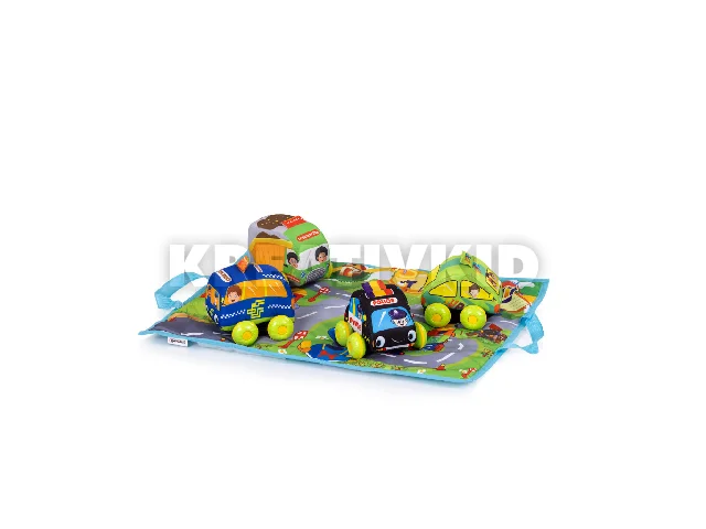 - 4 puha játékautó – rendőrautó, mentőautó, taxi és családi autó, élénk színekkel és barátságos arcokkal tervezve.