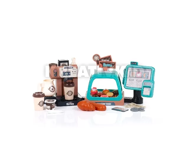 - Tartalmaz 41 különálló játékot és kiegészítőt - kávéfőző víztartállyal, csészék, érmék és bankjegyek, képernyő POS terminállal, vitrin édességekkel;