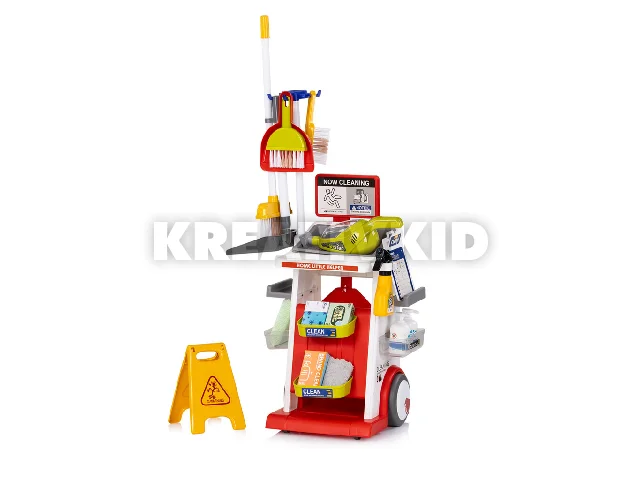 - Valósághű kiegészítőkkel - Kefékkel, felmosóval, szemeteslapáttal, szórófejes flakonnal, fertőtlenítőszeres flakonokkal, szivaccsal, törlőkendőkkel, nedves zsebkendőkkel, szappantartókkal, figyelmeztető táblával és egy kézi porszívójátékkal is rendelkezik!