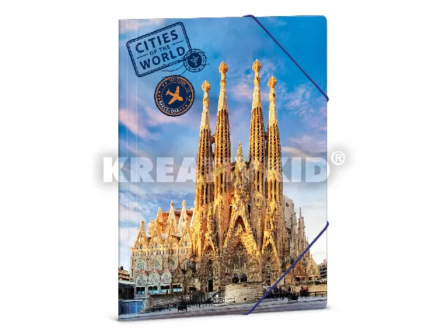 A/4 méretű gumis dosszié iratok, füzetek tárolására. 350 gr-os vastag kartonból készült dosszié lekerekített első sarkokkal, színes gumi zárópánttal. Külseje négy színnel, fényes fóliával nyomott. Belső oldala nyomatlan.