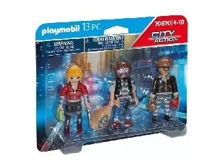 Playmobil: SWAT figuraszett 71146. Tartalma: 2 SWAT rendőr, 1 SWAT rendőrnő, 1 szélhámos, 1 sisak, 1 gumibot, 1 pajzs, 1 búvárlámpa, 1 szigony, 1 zseb...