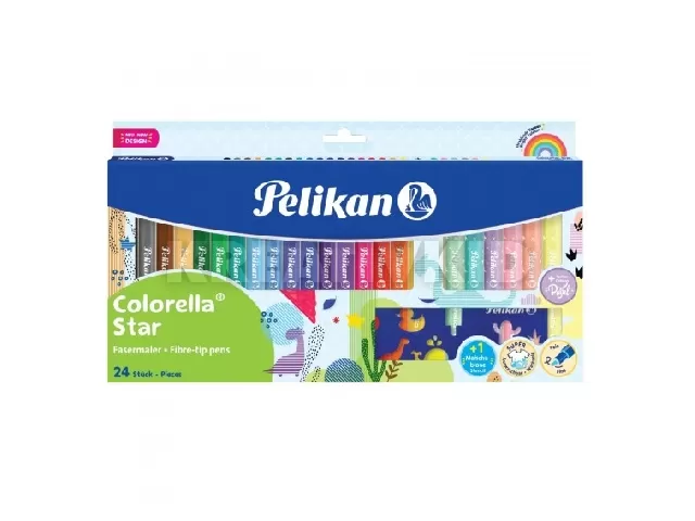 Colorella Star C302-es filctoll/24 szín, 18 élénk + 6 pasztell színnel, vízbázisú festékkel, mely a legtöbb textilből kimosható, biztonsági kupakkal. A készletben egy sablonvonalzó is található cuki és trendi alakzatokkal.