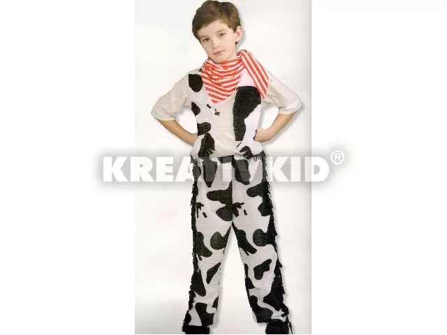 A Rubies jó minőségű jelmezeinek tárából a cowboy jelmez a klasszikus tehénfoltos mintázatban pompázik. Az oldalán rojtos ruha felsője egybevarrt a mellénnyel. A kényelmes viselet a farsangi bálon is praktikus, hiszen a kisfiút nem zavarja a játékban. A kosztümhöz piros-fehér csíkos sál is tartozik a teljes összképért.