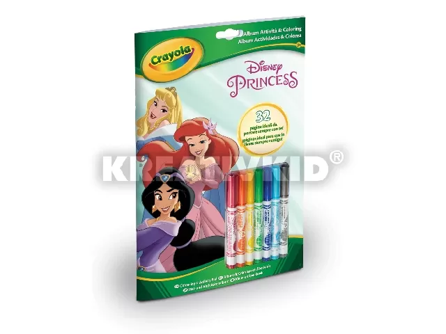 A 32 oldalas Crayola foglalkoztatóban különböző játékok várnak, kezdve a kirakókon és a labirintus játékokon át a kifestőkig. A Disney hercegnői foglalkoztató könyv mellett 7 kimosható filc található. A játék mérete kb. 1,6 x 20,3 x 28,9 cm. A játék 3 éves kortól ajánlott.