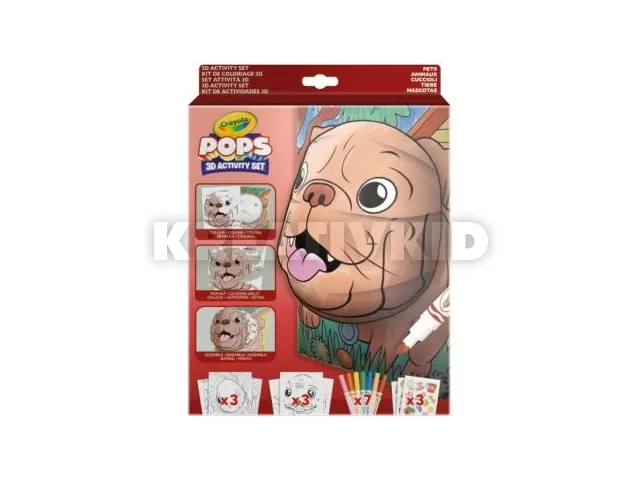 A Crayola POPs kisállatok tematikájú 3D foglalkoztató csomagjával a gyerekek háromdimenziós hatású képeket készíthetnek. A csomagban 3 háttér, 3 db 3D-s lap, 7 db filctoll és 3 ív matrica kapott helyet. A lurkóknak nincs más dolguk, mint kiszínezni a hátterek egyikét és a hozzá tartozó 3D hatású lapot, majd ez utóbbit a „kipattintani", és az utasításoknak megfelelően odailleszteni a helyére.
