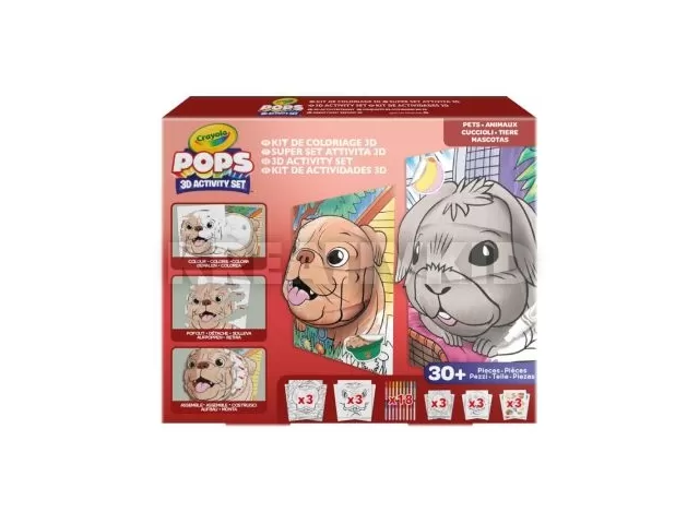A Crayola POPs kisállatok tematikájú 3D mega foglalkoztató csomagjával a gyerekek háromdimenziós hatású képeket készíthetnek. A csomagban 6 háttér (3 kicsi és 3 nagy), 6 db 3D-s lap, 18 db filctoll és 3 ív matrica kapott helyet. A lurkóknak nincs más dolguk, mint kiszínezni a hátterek egyikét és a hozzá tartozó 3D hatású lapot, majd ez utóbbit a „kipattintani", és az utasításoknak megfelelően odailleszteni a helyére.