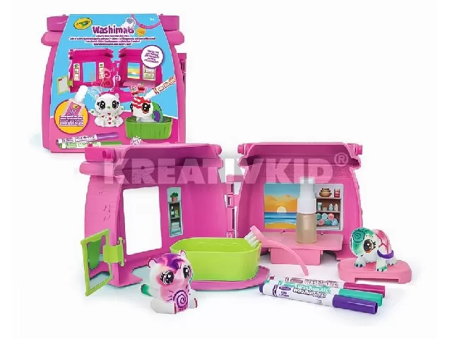 A Crayola Washimals Illatos fürdő szett 2 db aranyos állatkát és egy dobozként is funkcionáló játékteret rejt. Az állatokat a gyerekek szabadon színezhetik és firkálhatnak rájuk újra és újra, ugyanis lemoshatók. A dobozban 3 db lemosható filctoll és egy kefe is található.
