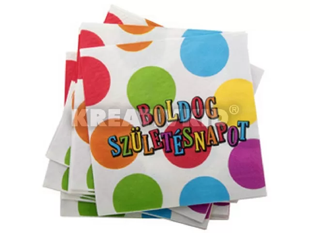 Használj a szülinapi bulin mintás szalvétákat! A Boldog születésnapot szalvéta 16 darabos készlet fehér alapszínű, színes szegéllyel mintázott, Boldog születésnapot feliratú papír szalvétákat tartalmaz, amik praktikusak egy zsúron. A szalvéták puhák, és nem a buli végén hosszasan mosni, takarítani. A Boldog születésnapot szalvéta 16 darabos készlet méretei: 33 x 33 cm.