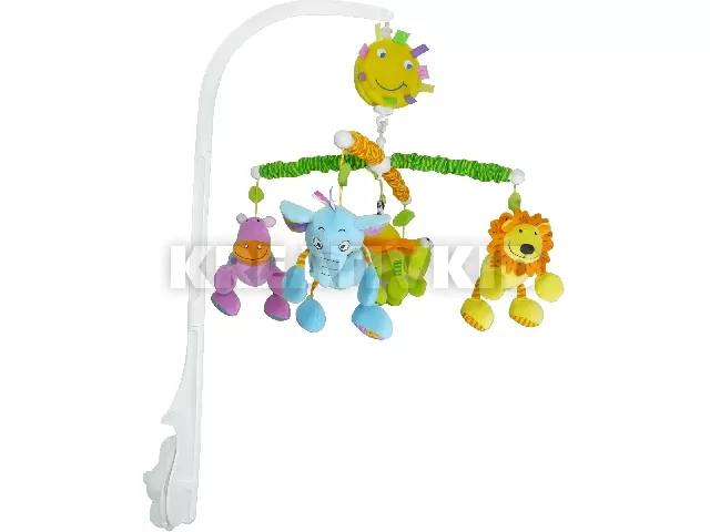 Könnyen összeállítható és a nagyméretű rögzítőcsavar segítségével a legtöbb kiságyra rögzíthető. Elemet nem igényel, felhúzószerkezettel működtethető. Lágy dallamokkal szórakoztatja, megnyugtatja a kisbabát, miközben a vidám és színes textil állatfigurákat nézegetheti. Később kis kezeit, lábait nyújtogatva megpróbálja elérni a játékot. Ügyelni kell arra, hogy a felfüggesztés mindig biztonságos távolságban legyen a gyermektől!