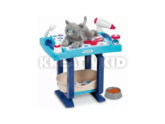 Állatorvosi vizsgálóasztal készlet 13 kiegészítővel: Macskaápoló asztal, plüss macska, zuhanyzó, szárítógép. Méretek: 40x29x35 cm, 18 hónapos kortól.