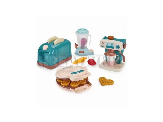 Kis háztartási készülékek készlete, beleértve egy eszpresszógépet kávéhoz, csésze turmixgéphez, gofrisütő és kenyérpirító. 15 tartozék.