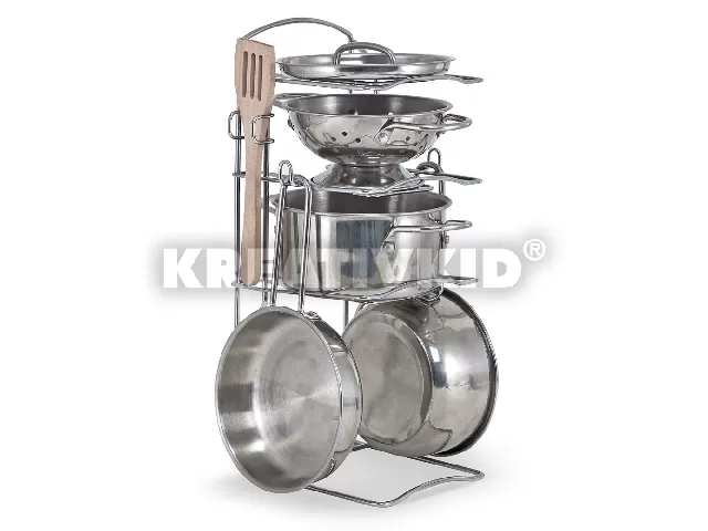 Válj konyhád legügyesebb asszonykájává az M & D edények és lábasok szettjével! A szett különböző méretű lábasokat és edényeket tartalmaz, mellyel remekül eljátszhatók a konyhai ténykedések, a játékos sütés-főzés. Dolgos kislánya így egyszerűen imitálhatja a szorgos anyukát. A szetthez egy fakanál is hozzátartozik. Tárolását egy, a szetthez járó tartó teszi könnyűvé.