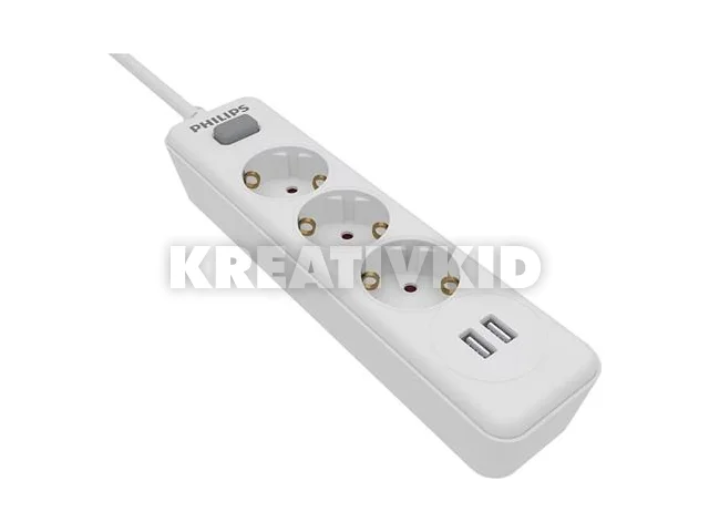 Elosztósor, 3 csatlakozóaljzat, 2xUSB-A, 2 m kábel, PHILIPS, fehér