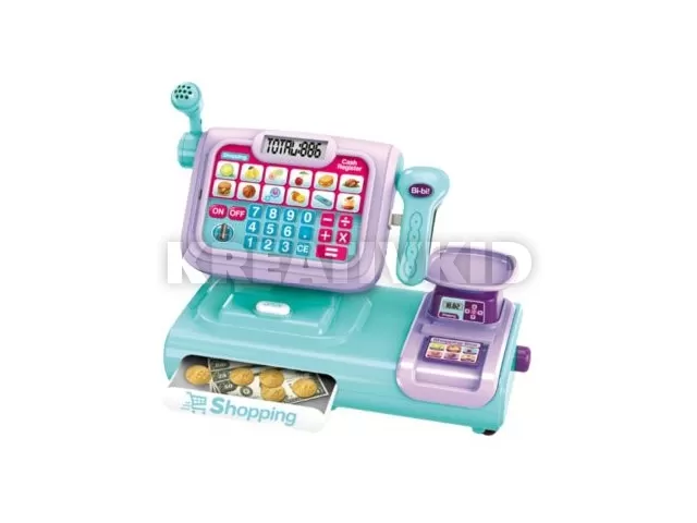 Érintőképernyős pénztárgép kiegészítőkkel és hanggal, 12 kiegészítővel. Tartalma: 1 db érintőképernyős pénztárgép hanggal, mikrofonnal, nyitható fiókkal, csipogó szkennerrel, kártyanyílással, 12 kiegészítővel (pl. pénzek, és bankkártya).