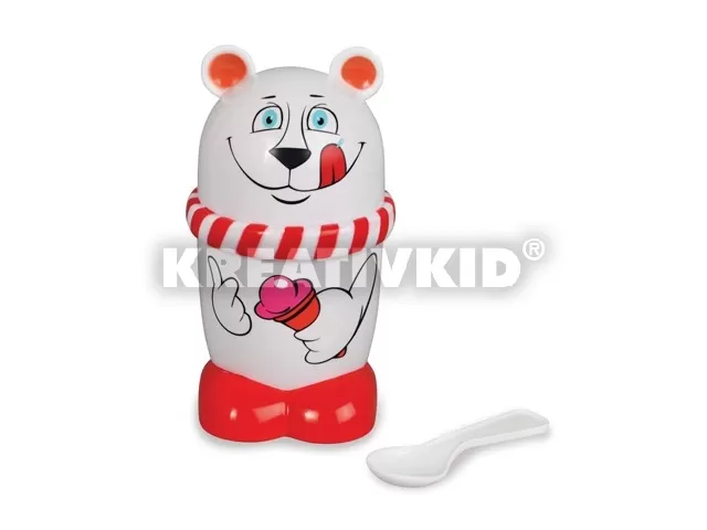 A kedves Jegesmedve arcot mintázó bögre piros talpakkal, s jópofa rózsaszín fülekkel ellátott, s az oldalán piros-fehér csíkos minta fut körbe.