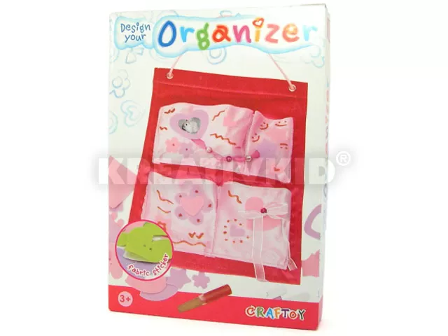 A kisebbik tartó piros és rózsaszínű. Fényesen csillogó selymes tapintású anyagból készült. Négy zsebet találunk rajta. A csomagban található öntapadó formákkal, csillámos ragasztóval díszíthetjük. Egyediségét a kialakított mintákkal és az öntapadós keretben felhelyezett fényképpel érhetjük el.