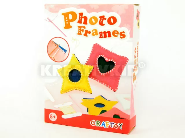 Fényképtartó készítő játék. Anyaga filc. A varrásnak megfelelően ki van lyukasztva, így a gyerekek egy vastag műanyag tű segítségével könnyedén varrhatják össze a darabokat. A műveletek egyszerűek, gyorsan elsajátíthatóak. Kezdeti segítség után a gyerekek könnyen elkészíthetik ezeket a képtartókat. Könnyű, puha így bárhova felakasztható (autóba, ablakhoz, lámpára). Gyerekekről , házi kedvencről készült fényképpel igazán ötletes, saját kezűleg készített ajándék lehet. Garantált a sikerélmény, nincs buktató.