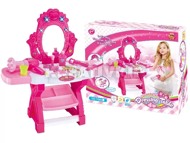 Tedd magadat ellenállhatatlanná a fésülködő asztalnál! A Fésülködőasztal fénnyel és hanggal egy, a szépségápoláshoz elengedhetetlen bútor, ami előtt ülve frizurát, sminket készíthetsz magadnak. A csomagban hajszárítót, hajcsavarókat, ékszereket is megtalálsz, ha leülsz az asztal elé, csak fel kell kapcsolnod a világítást, hogy vidám dallamok kíséretében sminkelhesd ki magadat. A játék 2 darab AA ceruzaelemmel működik, a csomagolás az elemeket nem tartalmazza. A Fésülködőasztal fénnyel és hanggal összerakott méretei: 65 x 26 x 68 cm.