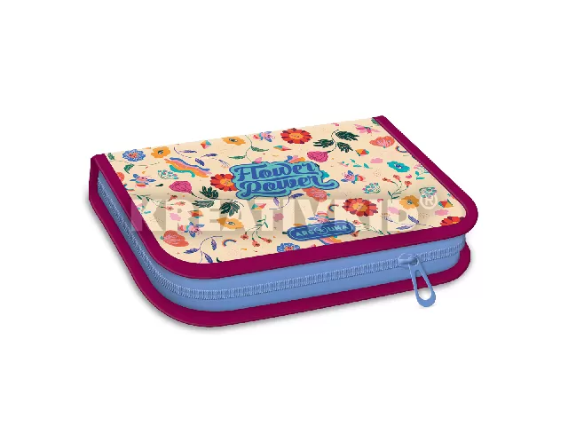 Írószerekkel töltött cipzáros tolltartó két kihajtható füllel, gumis kialakítással az írószerek tárolásához. Tartalma: 12 db színes ceruza, 3 db HB grafit ceruza, 1 vékony és 1 vastag postairón, 8 db színes filctoll, 1 db radír, 1 db hegyező, 1 db 17 cm-es egyenes vonalzó, 1 db háromszög vonalzó, órarend A és B hétre.
