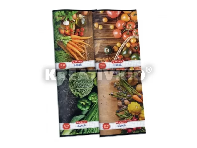 A5-ös méretű, 32 lapos, kockás iskolai füzet Zöldség, kapcsozott kivitelben, mintás fedlappal, hófehér belívvel, margóval, az x.book termékcsalád része,