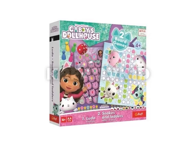 A Trefl 2 az 1-ben társasjáték Gabi babaháza köntösében. Klasszikus játékok: Ki nevet a végén? és Kígyók és létrák. Jól ismert szabályok, könnyen tanulható. Ki nevet a végén?: cél a bábuk bejuttatása a célba. Kígyók és létrák: mezők segítenek vagy visszavetnek. Kétoldalas tábla, Gabi babaháza szereplői díszítik. Csomagolás mérete: 24 x 24 x 5 cm.