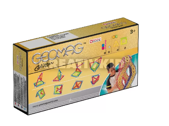 A Geomag Glitter készlet a megszokott ezüstös golyóbisok mellett élénk, vidám színű rudakat és paneleket tartalmaz, melyek mindegyike csillámos fénnyel ragyog. Építs lenyűgöző és látványos tornyokat, s más alakzatokat!