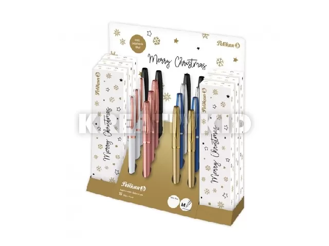 Display Merry Christmas / 16 db Jazz Noble elegance golyóstoll. Feltöltés: 3 x gyöngyfázfehér/rózsaarany, 3 x rózsaarany, 4 x fekete, 2 x ezüst, 2 x kék/ezüst, 2 x arany,16 db ajándékdoboz, 16 db merry christmas feliratos csomagolódoboz