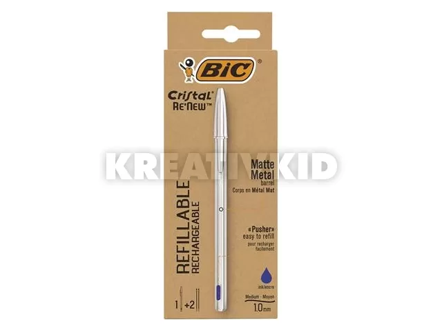Golyóstoll 0,32 mm, kupakos, matt ezüst színű tolltest, BIC "Cristal Re`New", kék + betét
