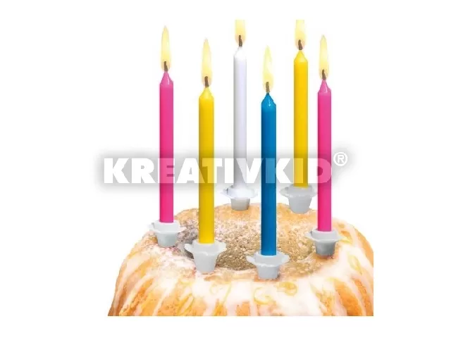 Színes tortagyertya 24 db, gyertyatartóval, bliszteres kiszerelésben.